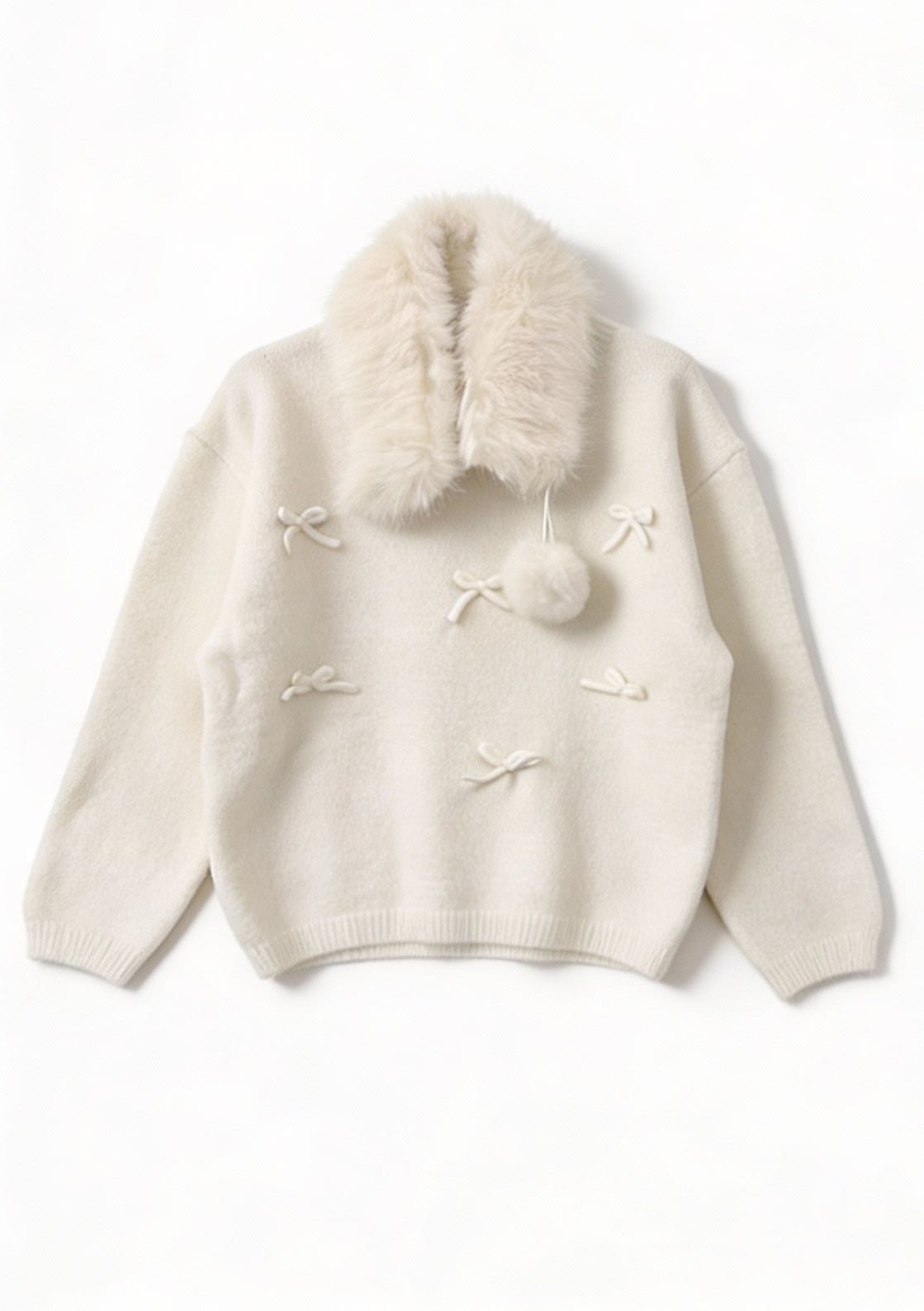 Cream Fur-Trim Hooded Knit Zip-Up Jacket