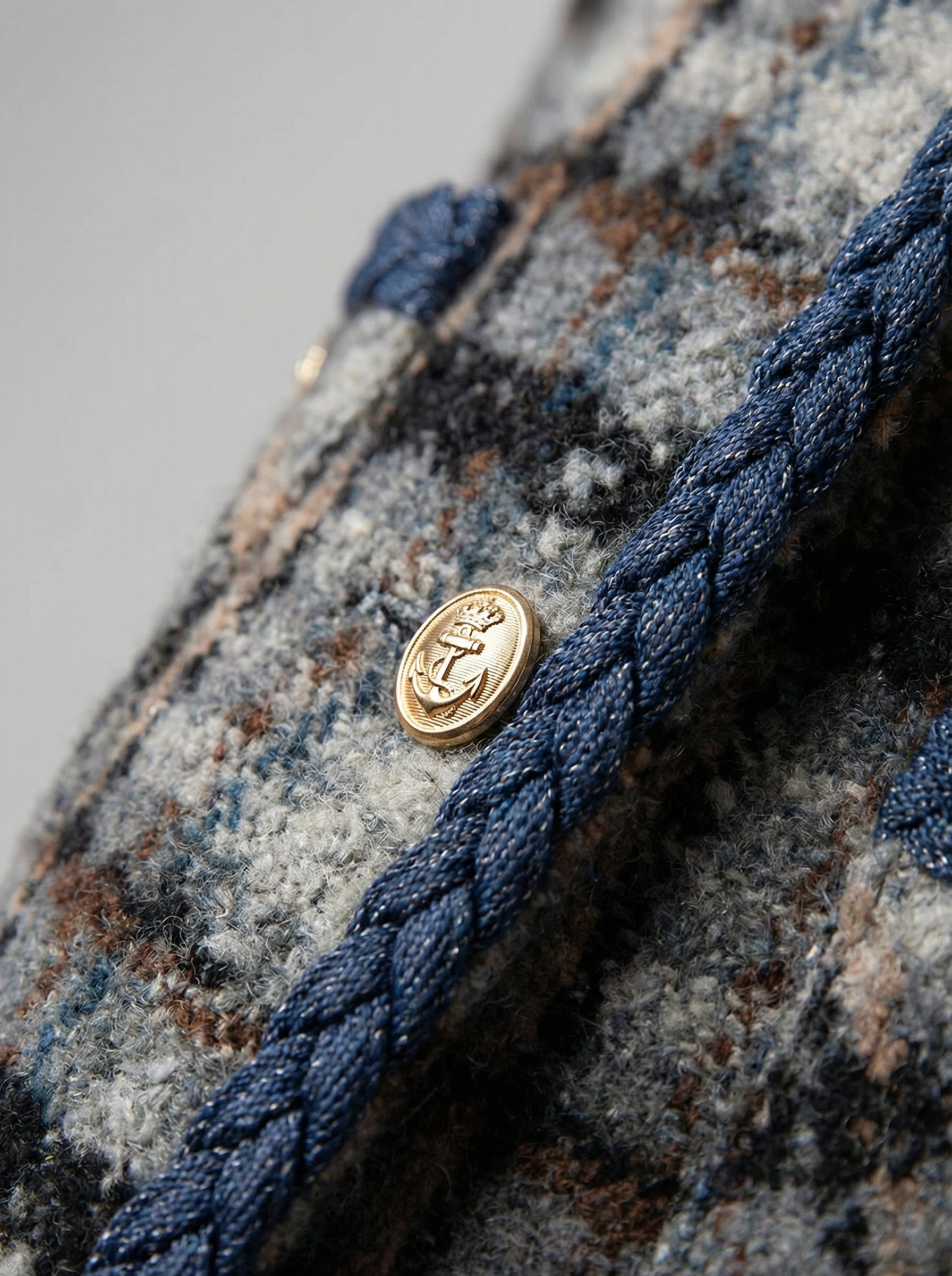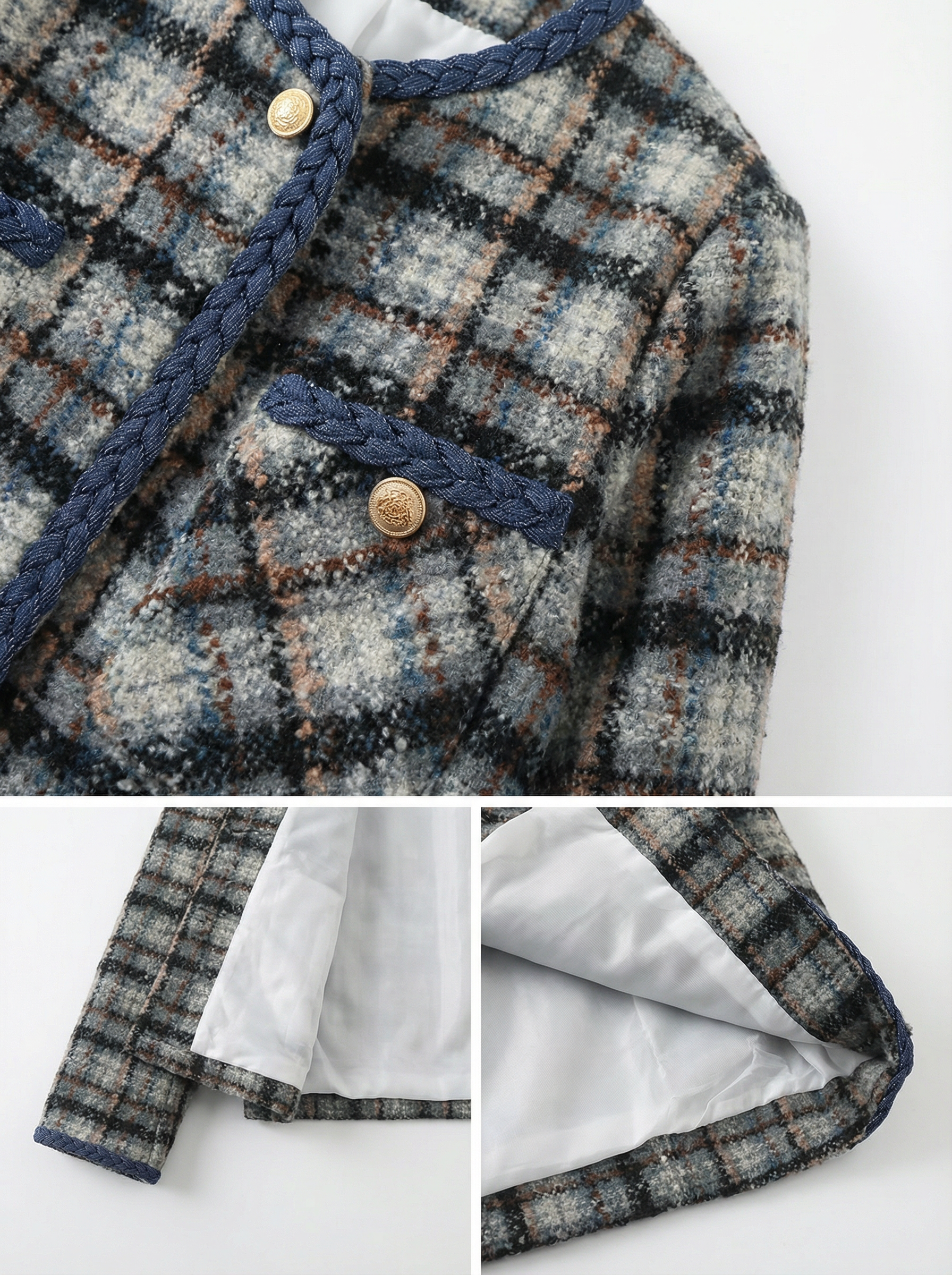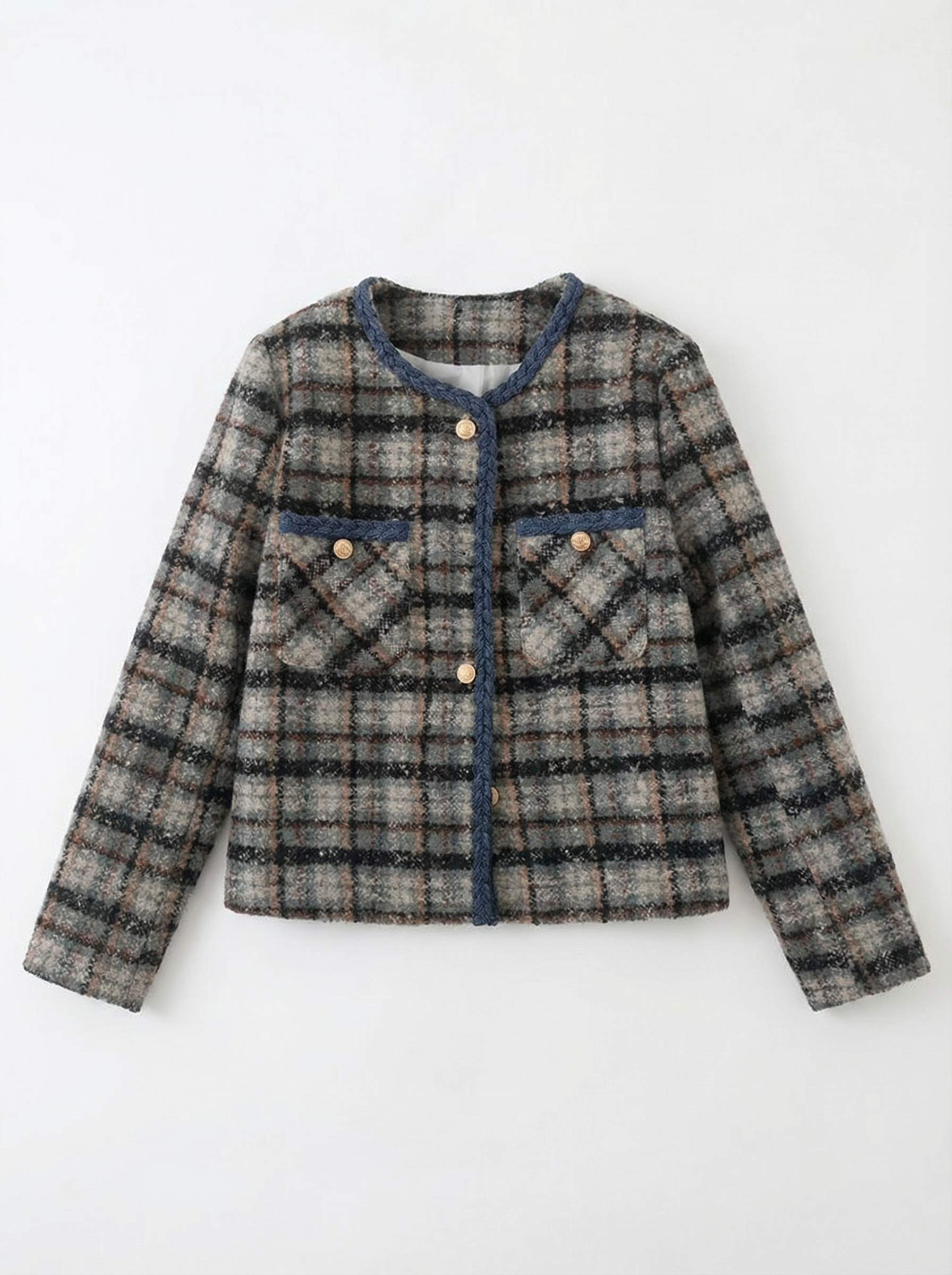 Plaid Tweed Cropped Jacket with Braided Trim 這件是經典Chanel-inspired小香風短款外套,灰黑棕色調格紋粗花呢/毛呢材質,領口、門襟及口袋邊緣有深藍色編織滾邊裝飾,金色圓扣點綴,無領圓領設計,版型挺括俐落,保暖又高級。非常適合秋冬優雅通勤或約會穿搭,常見於韓系/歐系品牌
