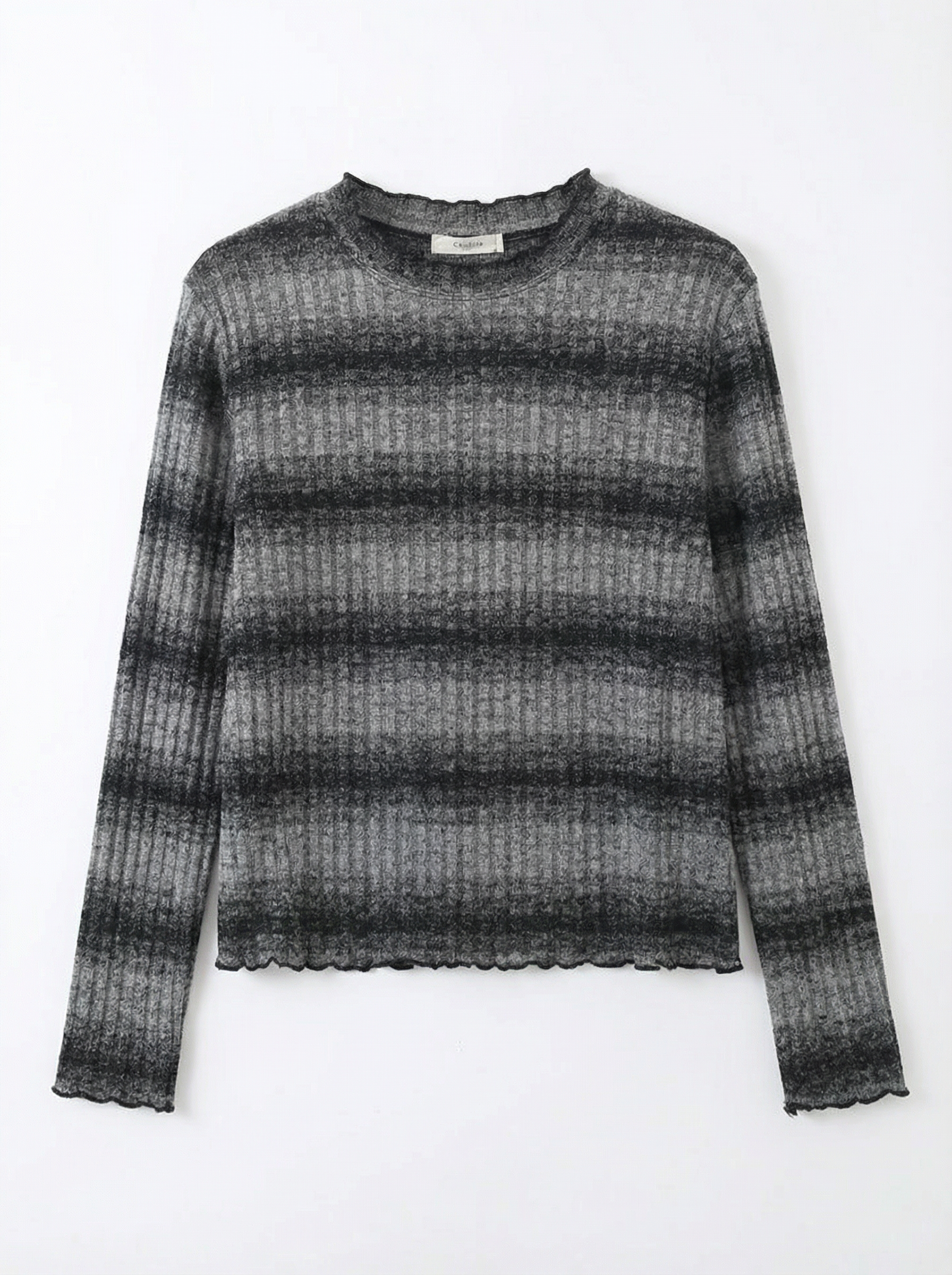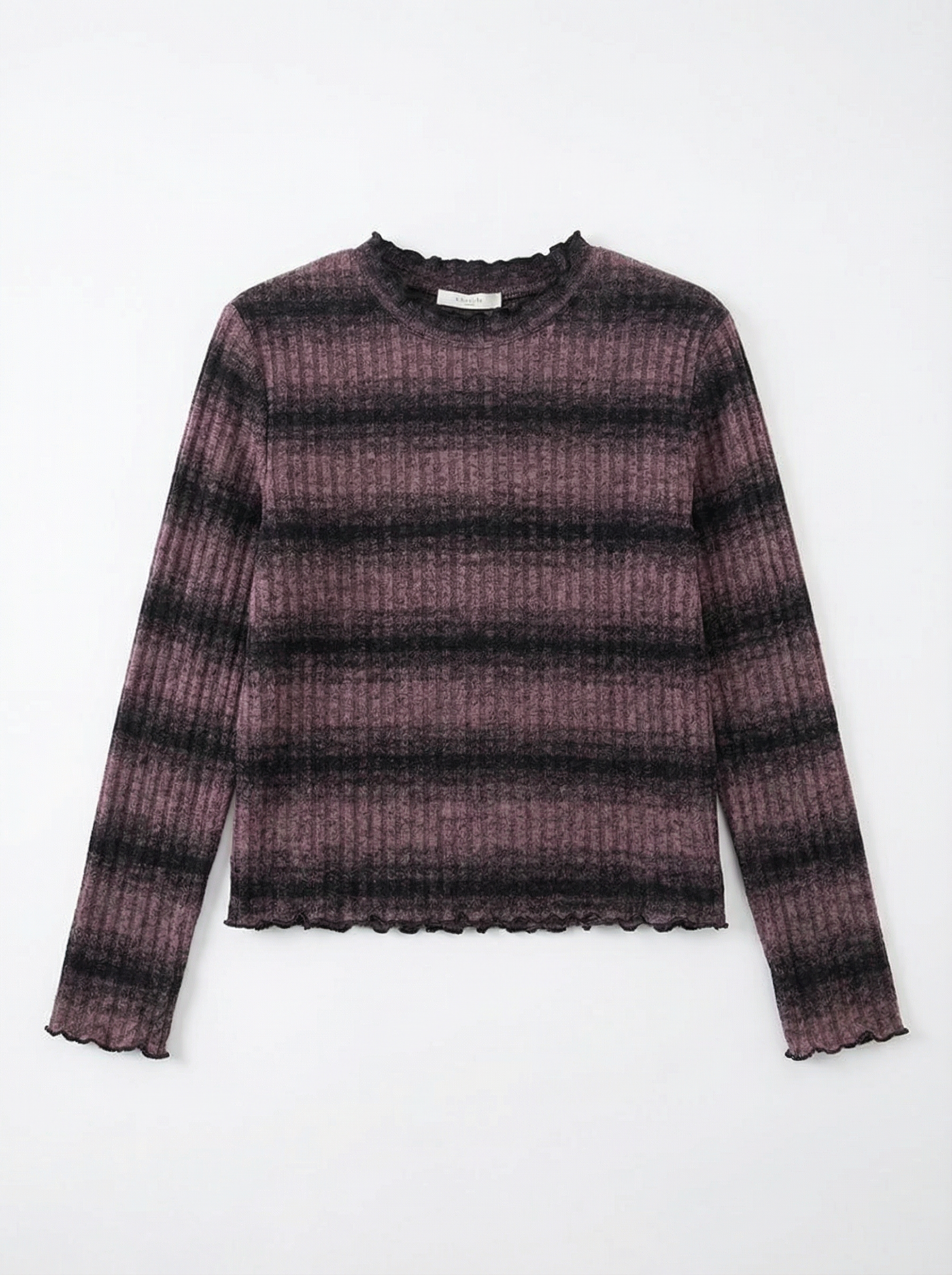 Stripe Lettuce Edge Long Sleeve Top 漸變條紋設計的薄款長袖針織上衣,領口、下擺與袖口有細緻波浪邊(lettuce edge)裝飾,材質輕薄帶點透膚感(混紡),版型修身微短,風格韓系浪漫/復古,適合單穿或層次內搭(如搭背心、外套)。