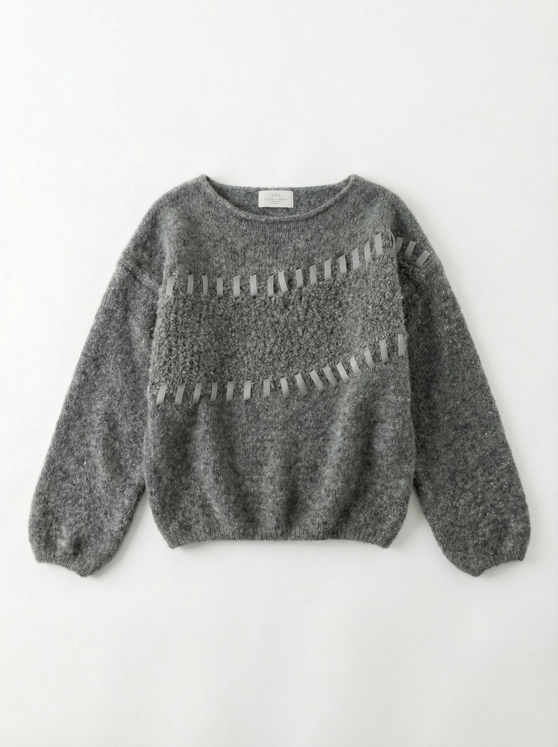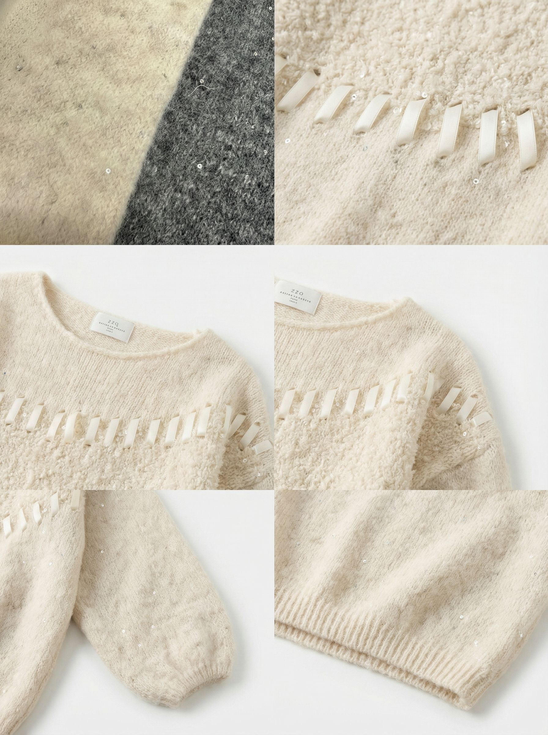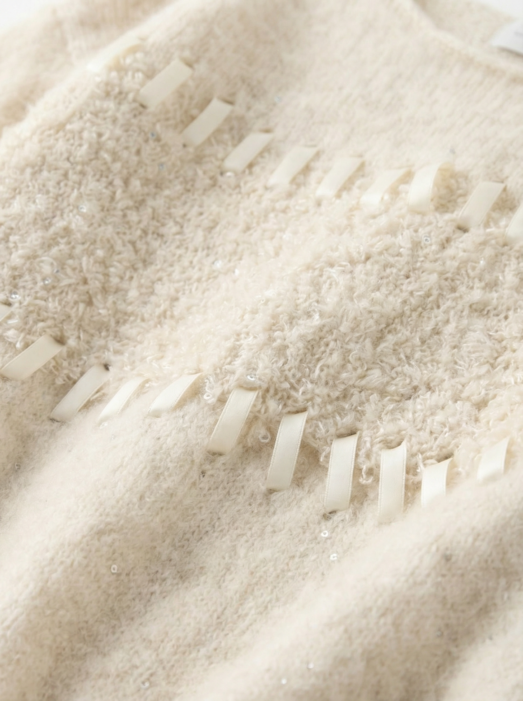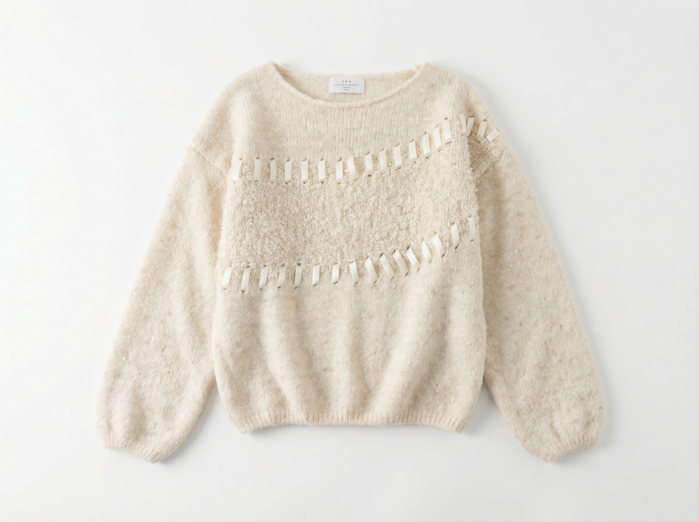 Ribbon Tape Detail Knit Sweater米色鬆身毛衣,胸前及肩部有白色緞帶狀縫線裝飾,強調簡約與意外細節。