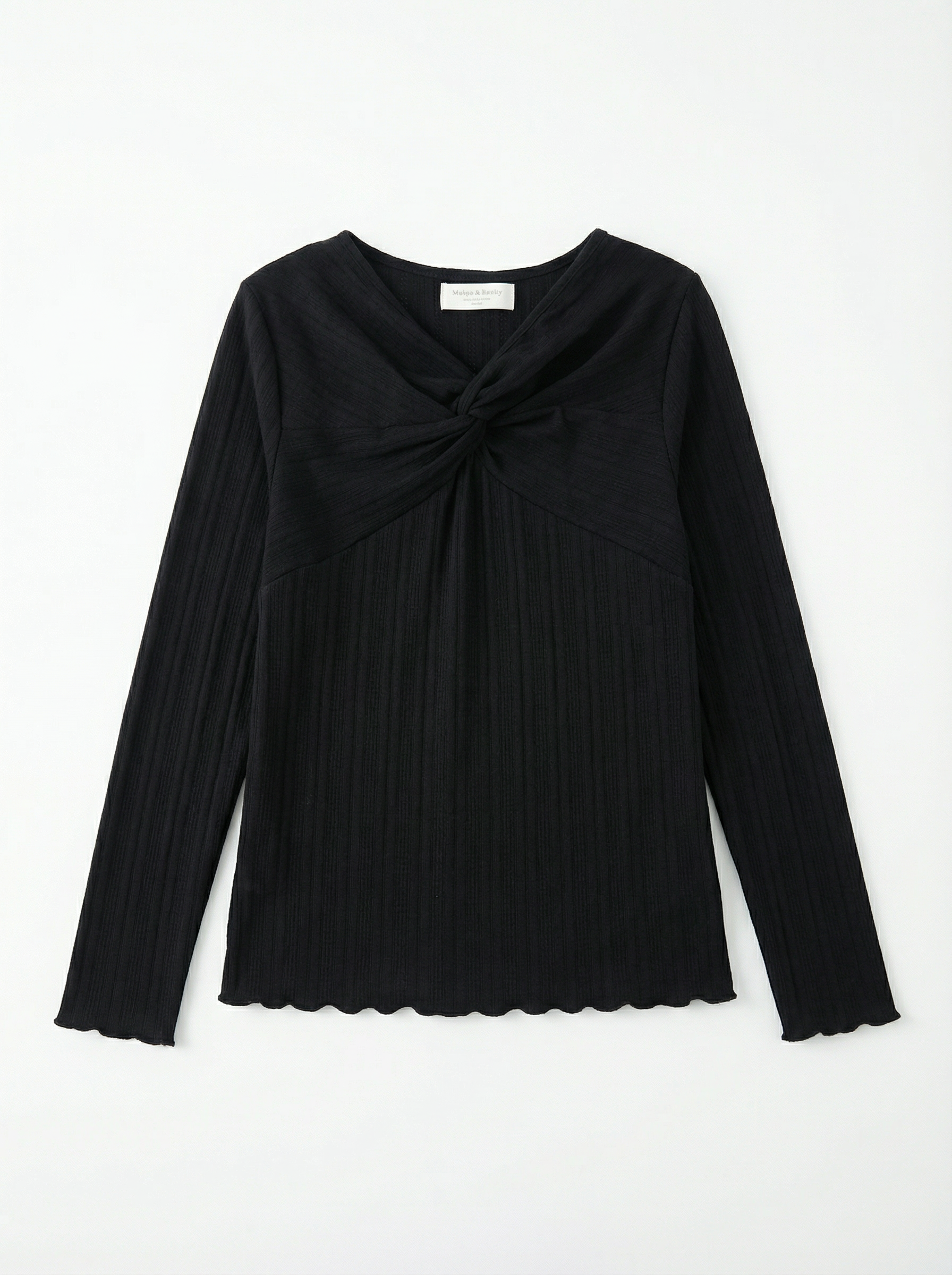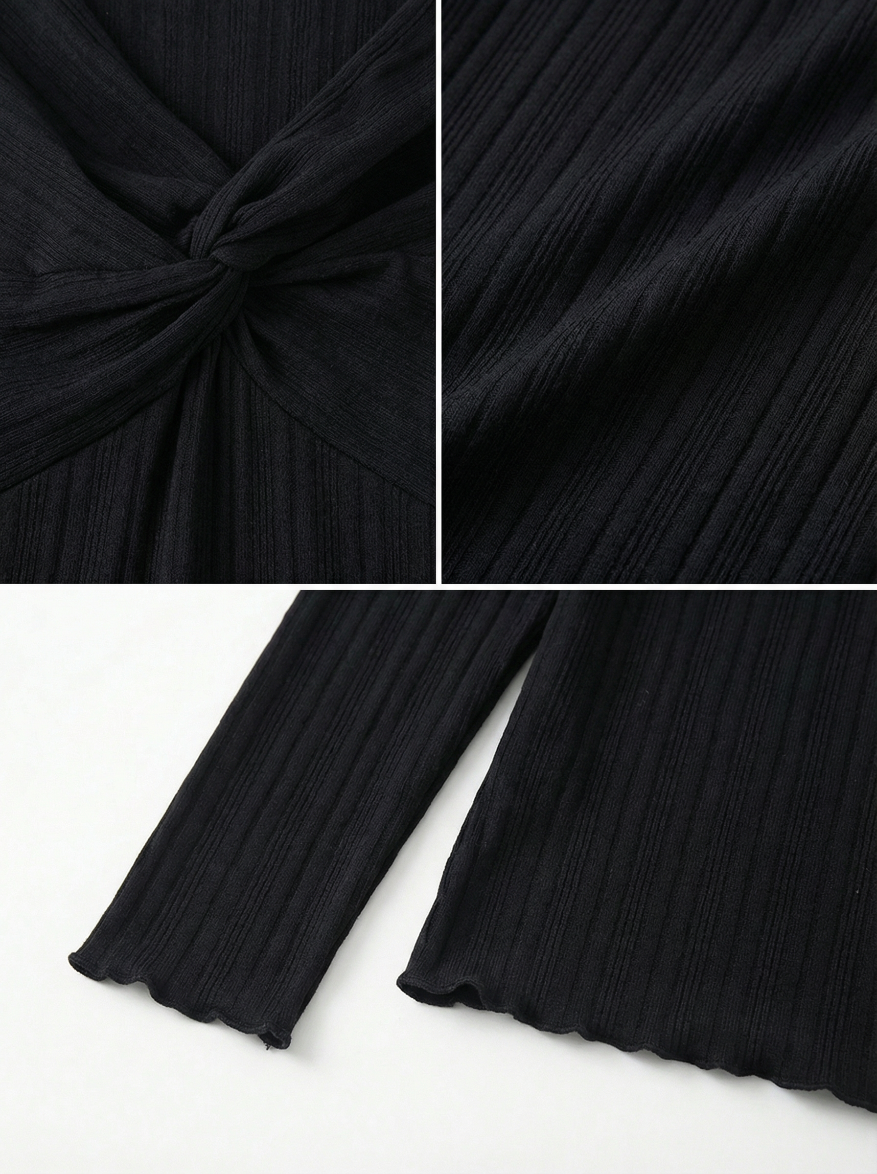 Twist Knot Front Ribbed Long Sleeve Top 羅紋針織長袖上衣,特色為胸前扭結(twist knot)設計形成V領視覺,下擺與袖口有細緻波浪邊(lettuce/ruffled hem),版型修身帶彈性,舒適又帶點性感浪漫