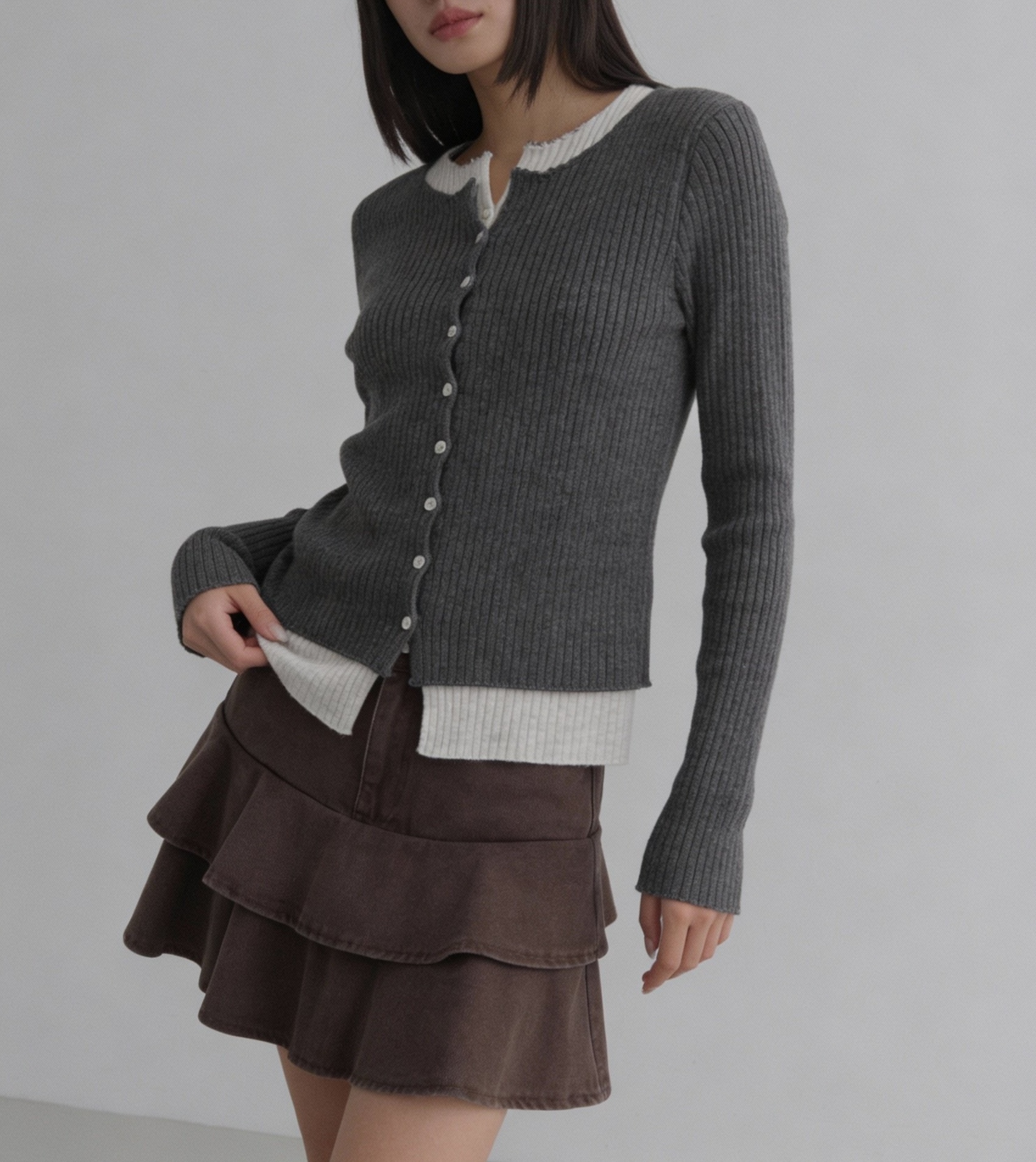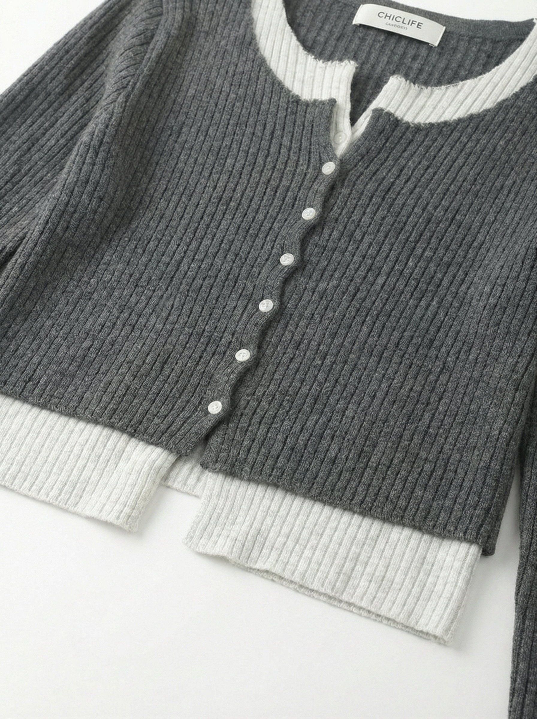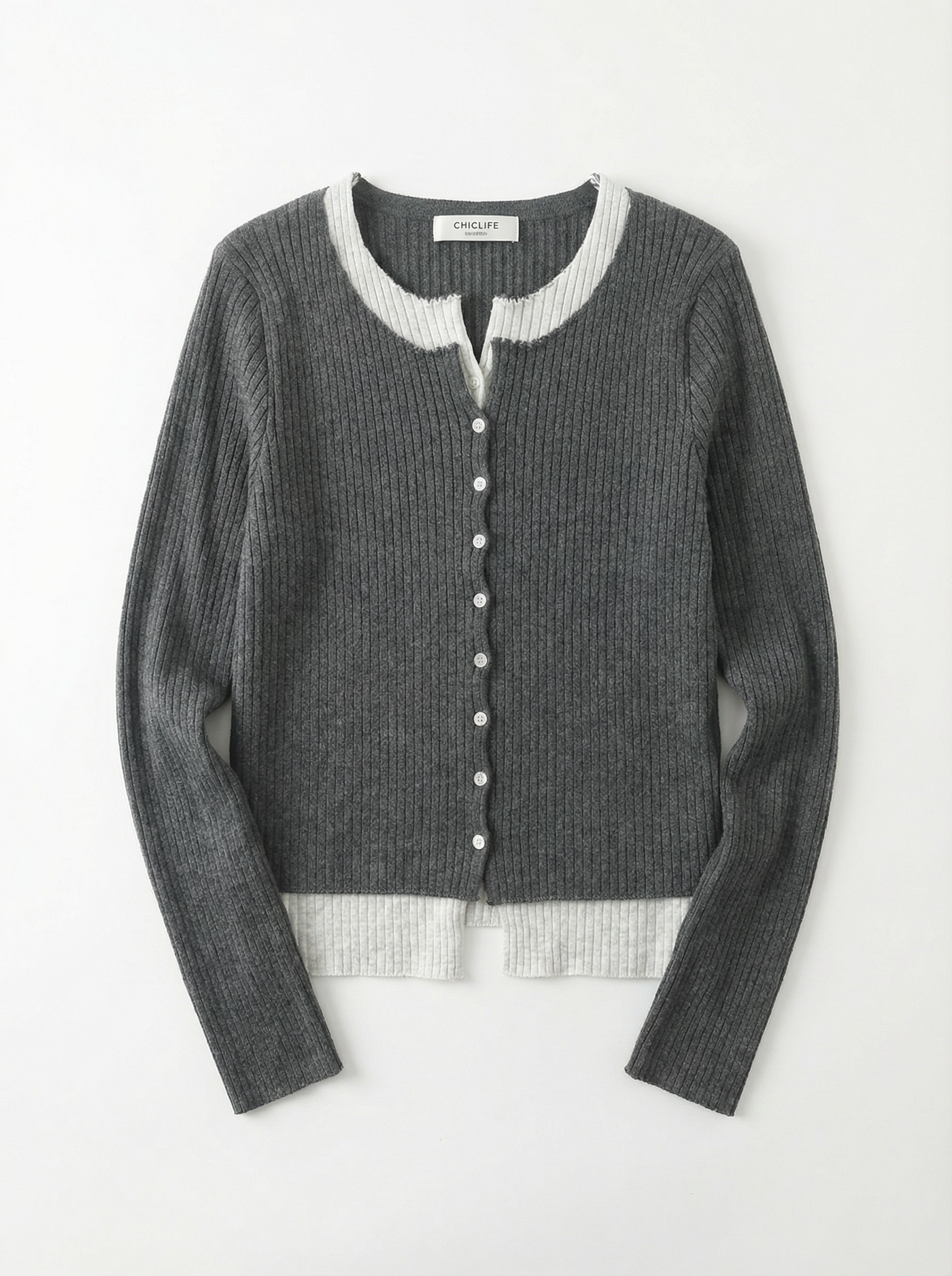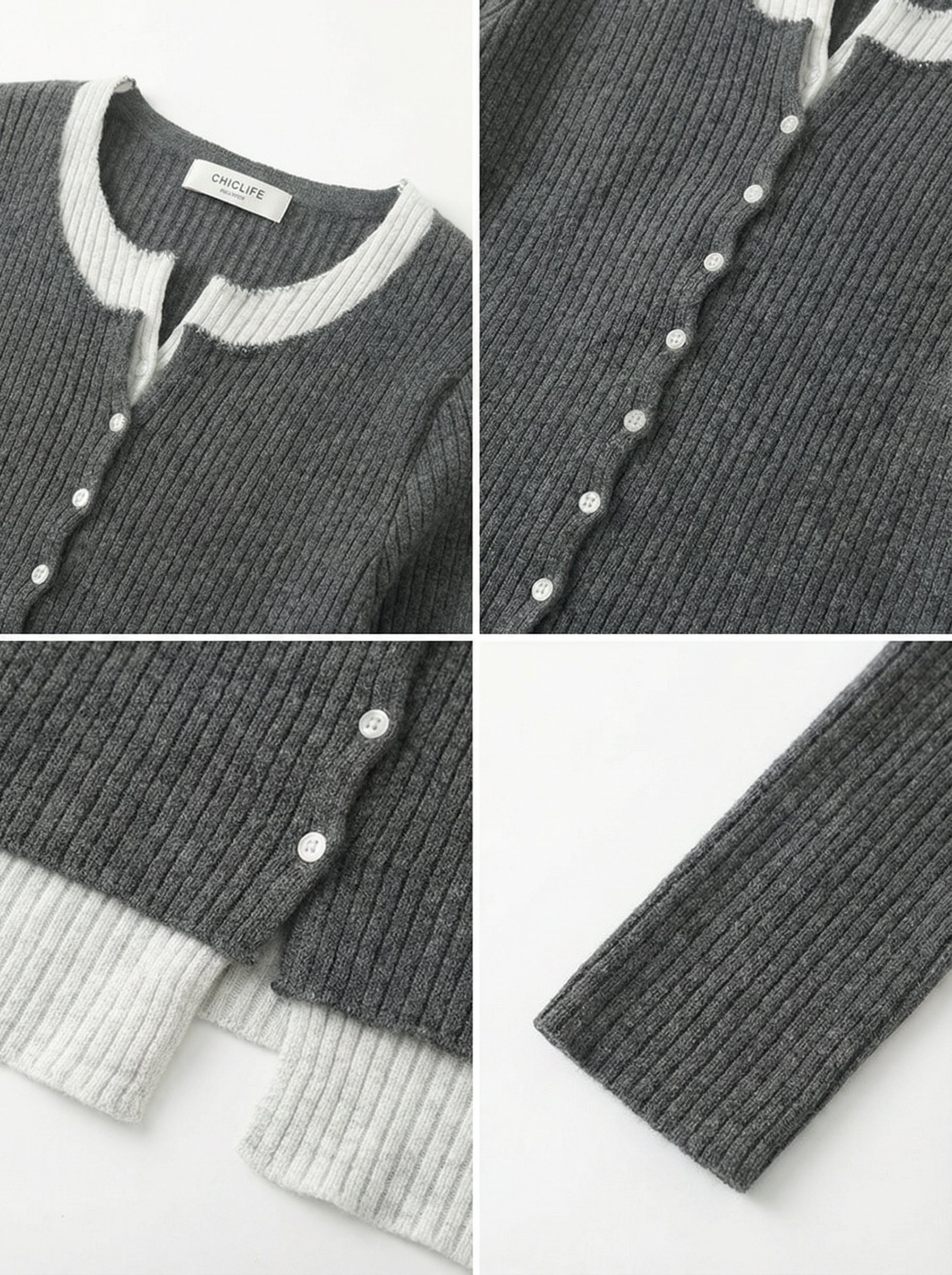 Contrast Trim Ribbed Knit 羅紋針織開衫,領口、下擺及邊緣有淺灰/白色撞色滾邊設計,營造假兩件層次感(layered look),前中鈕扣、crop 短版長度,風格簡約帶點復古chic
