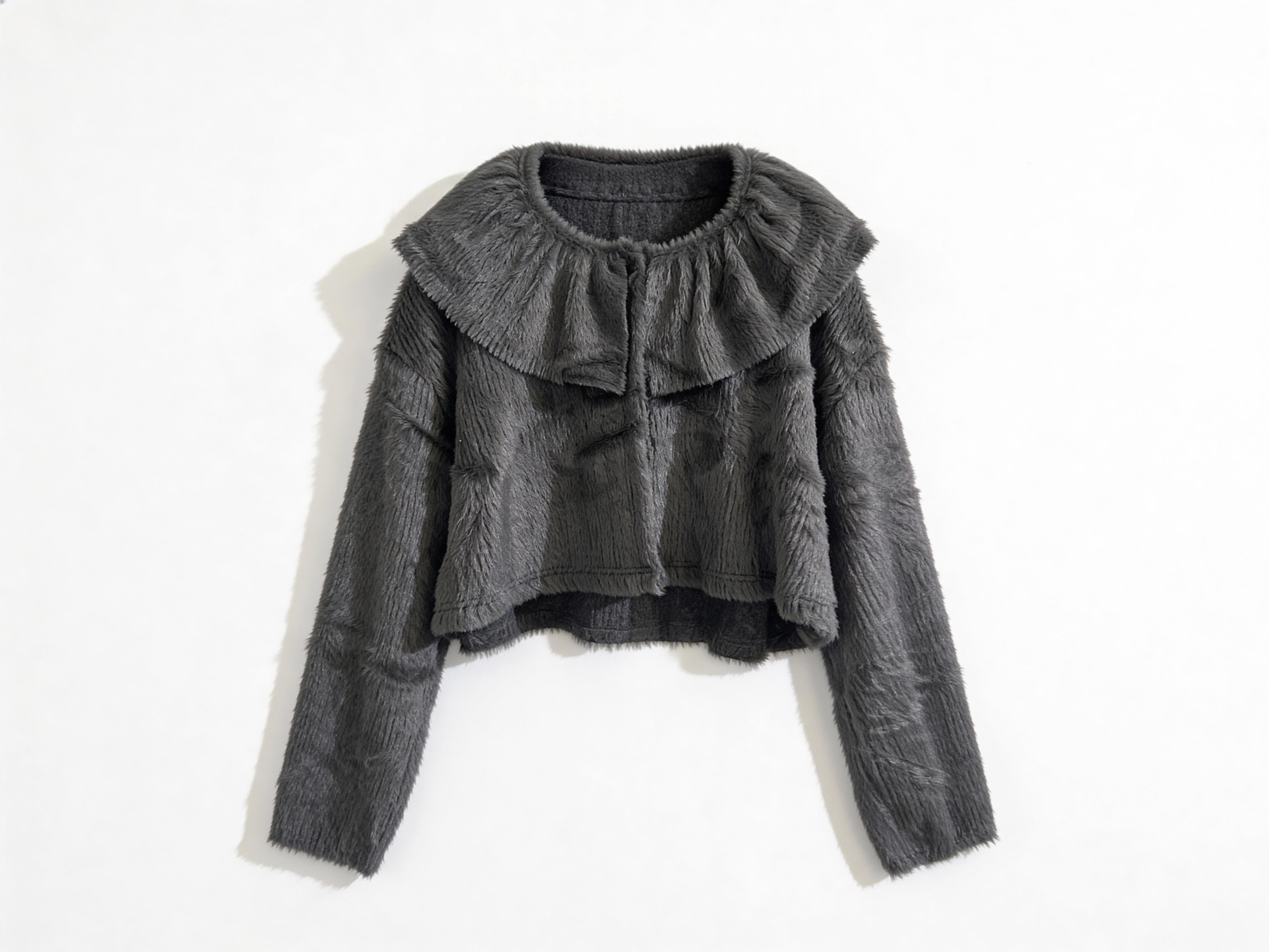 超大荷葉邊翻領、長袖、蓬鬆毛絨質感,剪裁為箱型短款,整體風格奢華且戲劇化。