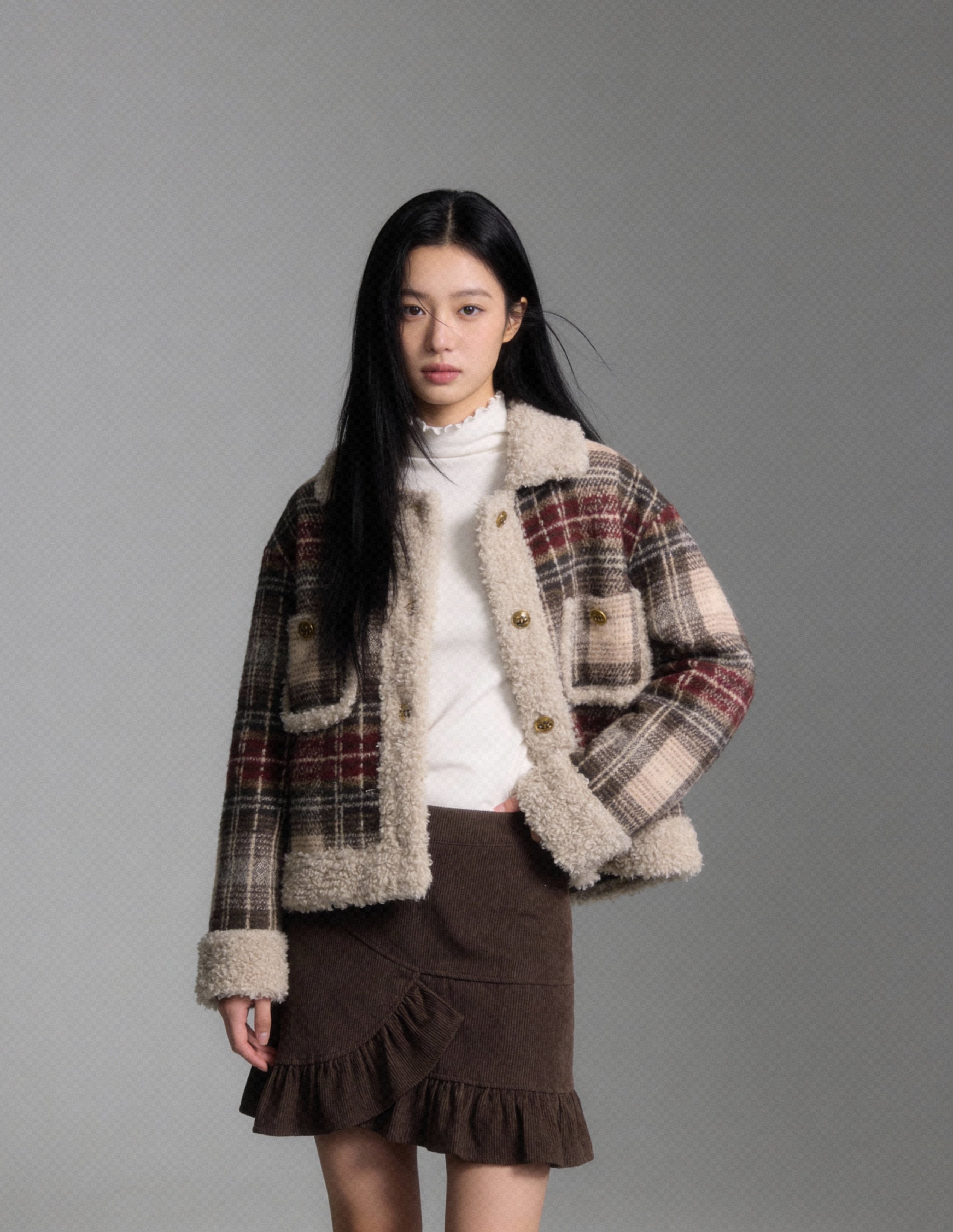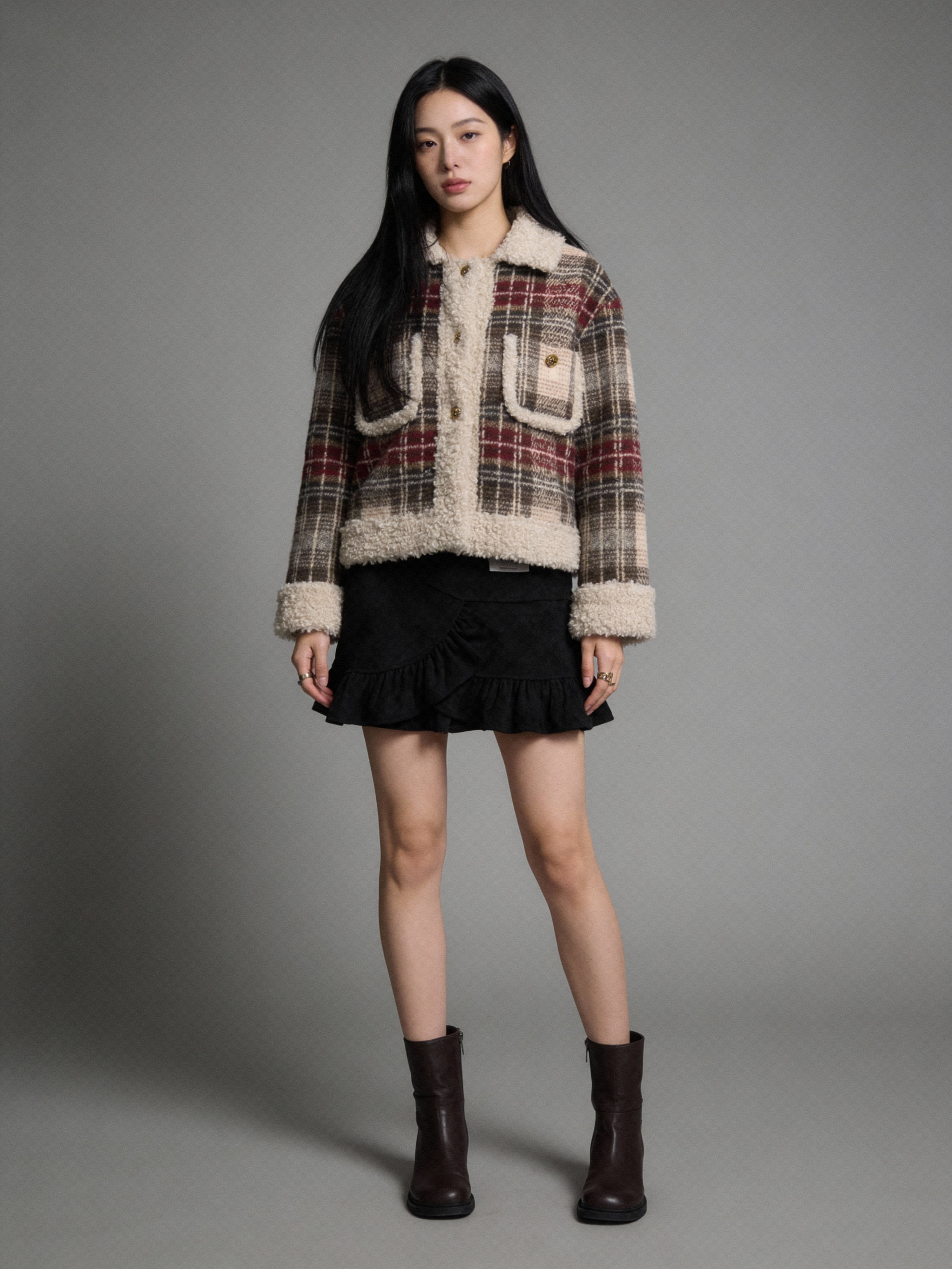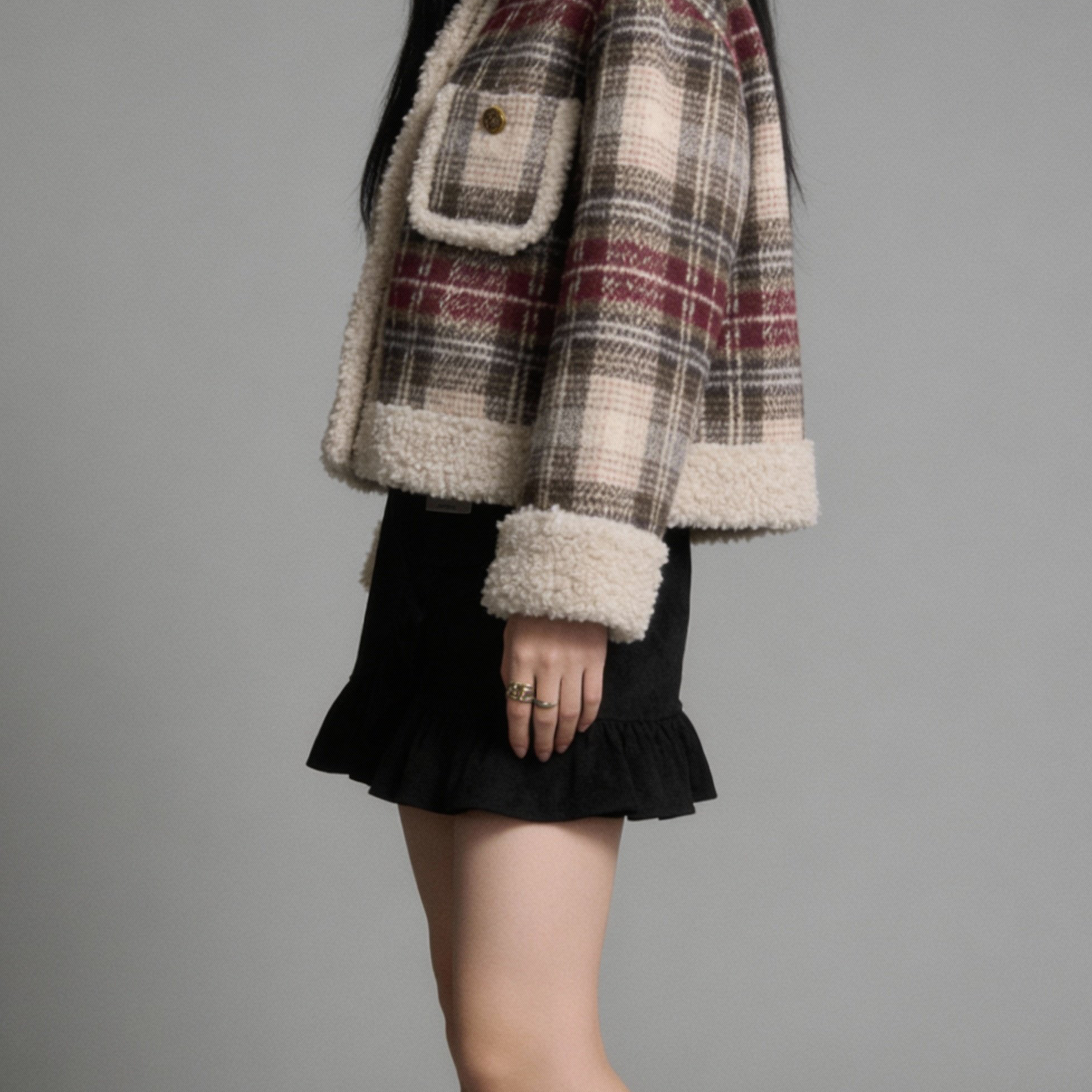 格紋羊羔毛拼接短款外套