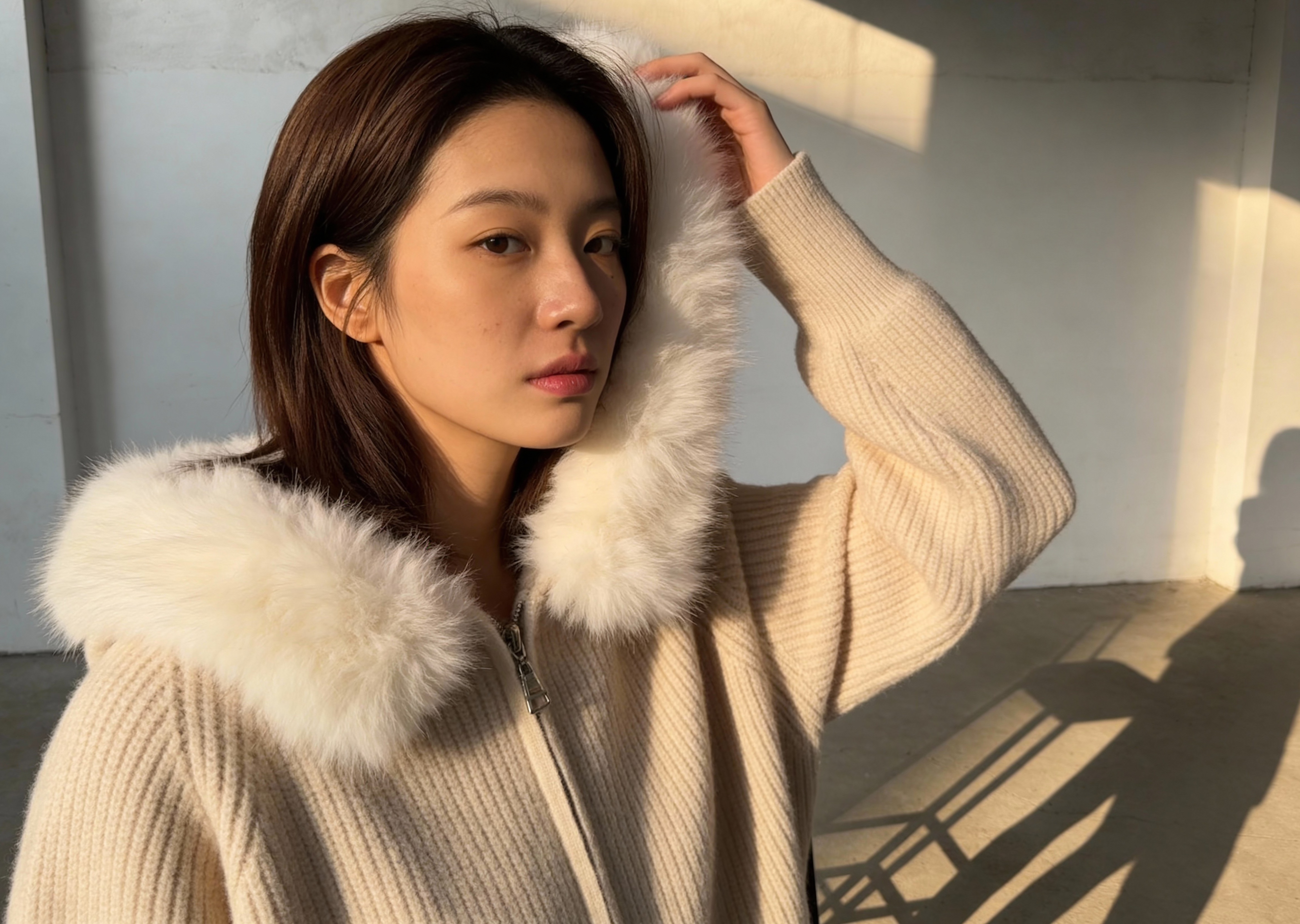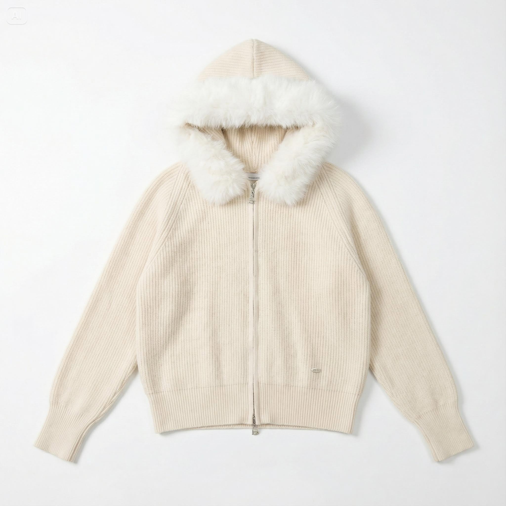Cream Fur-Trim Hooded Knit Zip-Up Jacket